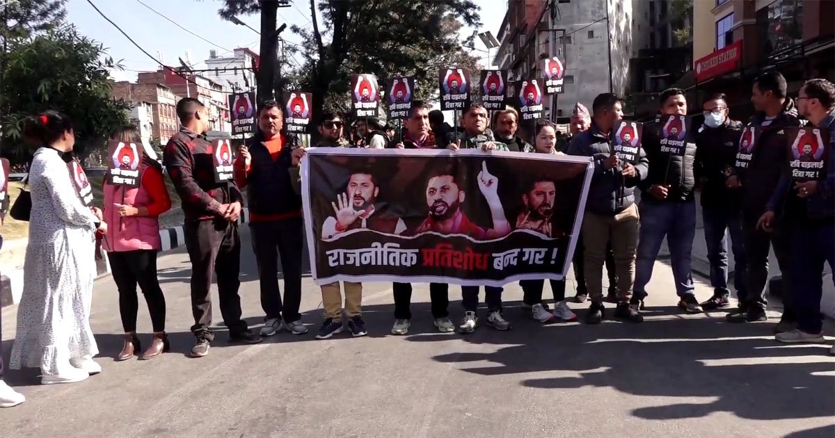 प्रदर्शनकारीहरूले रवि लामिछानेलाई रिहा गर, राजनीतिक प्रतिशोध बन्द गरु लेखिएका प्लेकार्ड प्रदर्शन गर्दै नारा लगाएका थिए ।