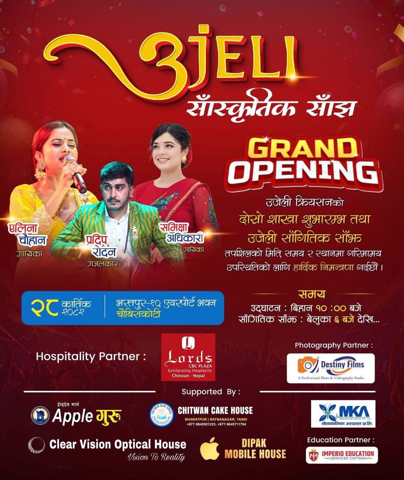 हाल सप्तगण्डकी चोकमा रहेको उजेलीले दोस्रो शाखा आज भरतपुरको चौविसकोठीमा शुभारम्भ गरेको छ । यही अवसर पारेर उजेली सांस्कृतिक साँझको आयोजना गरिएको हो । कार्यक्रमको सम्पूर्ण तयारी पूरा भइसकेको उजेलीकी प्रवन्धक विद्या पौडेलले जानकारी दिइन् । सांस्कृतिक कार्यक्रम आज बेलुका ६ बजेदेखि राति १० बजेसम्म चल्ने छ ।