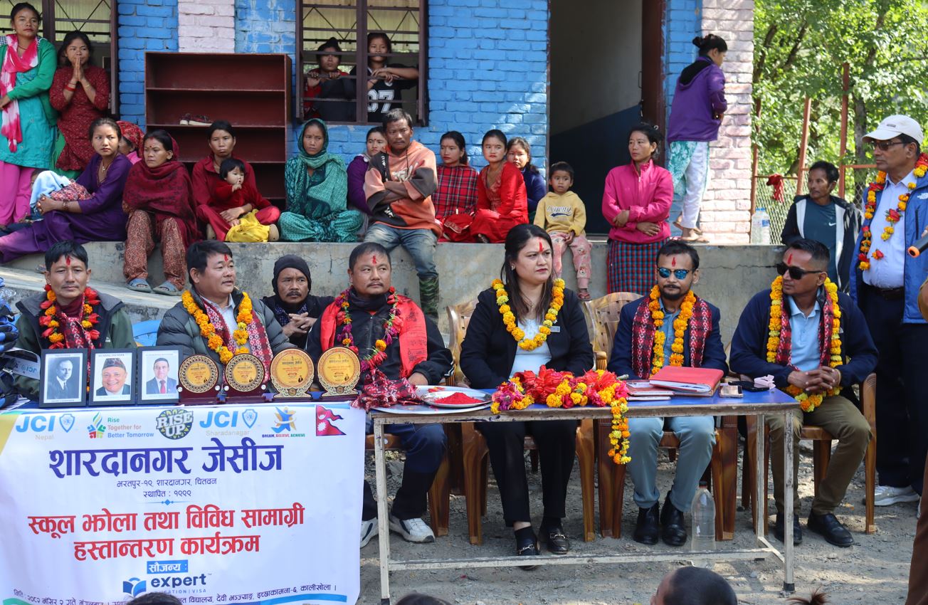 कार्यक्रमका प्रमुख अतिथि वडा नं.६ का वडा अध्यक्ष लक्ष्मण प्रजा, एक्सपर्ट एजुकेशन चितवनका रिजनल म्यानेजर किरण पौडेल, बिजनेस डेभलपमेन्ट म्यानेजर विनोदबाबु रिजाल, शारदानगर जेसीजकी अध्यक्ष लक्ष्मी केसीलगायतले विद्यार्थीहरुलाई ती सामग्री हस्तान्तरण गर्नुभयो ।