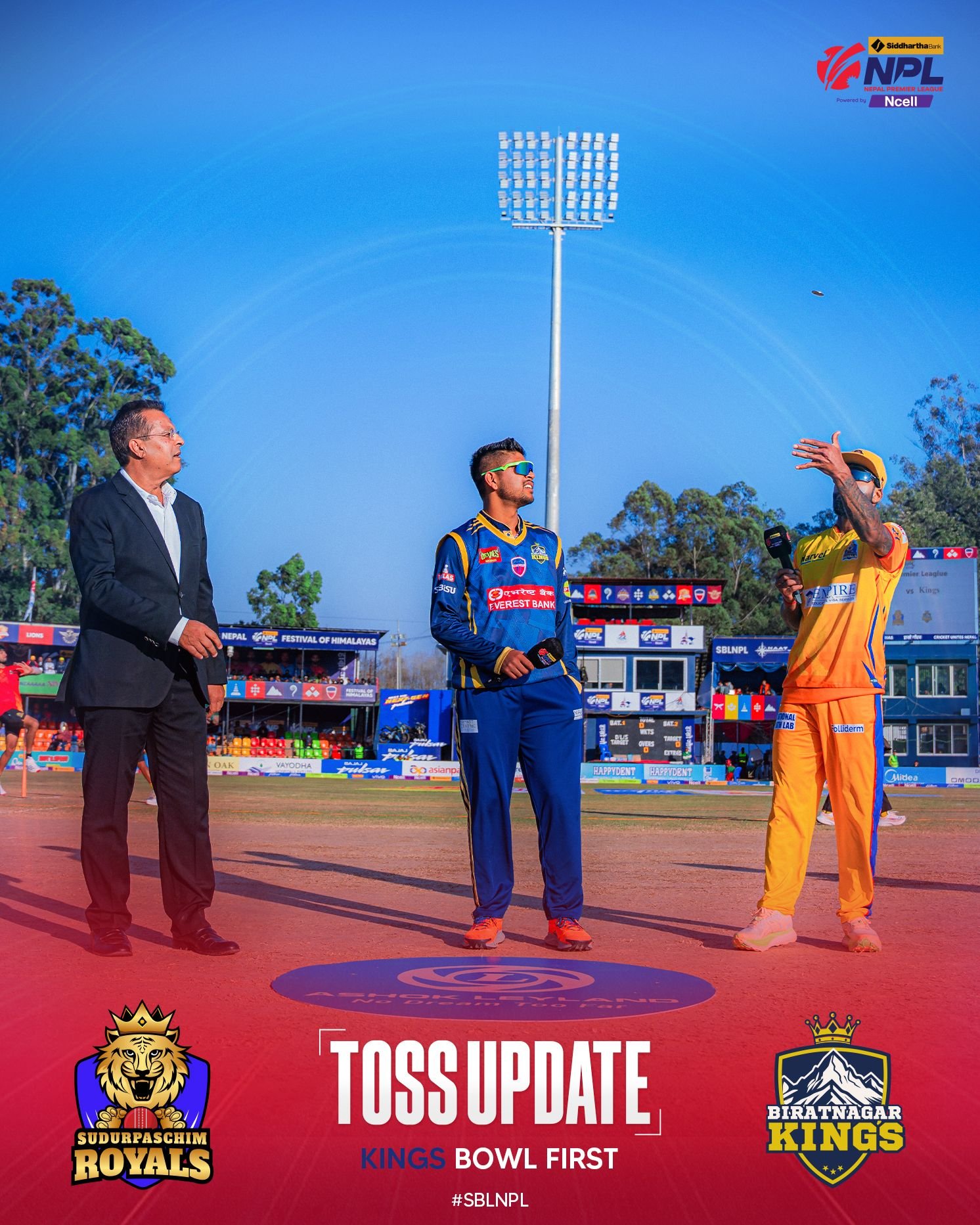 कीर्तिपुरस्थित त्रिभुवन विश्वविद्यालय अन्तरराष्ट्रिय क्रिकेट मैदानमा केही बेर अघि भएको टसमा विराटनगरका कप्तान सन्दीप लामिछानेले टस जितेर सुदूरपश्चिमलाई पहिले ब्याटिङको निम्तो दिए ।