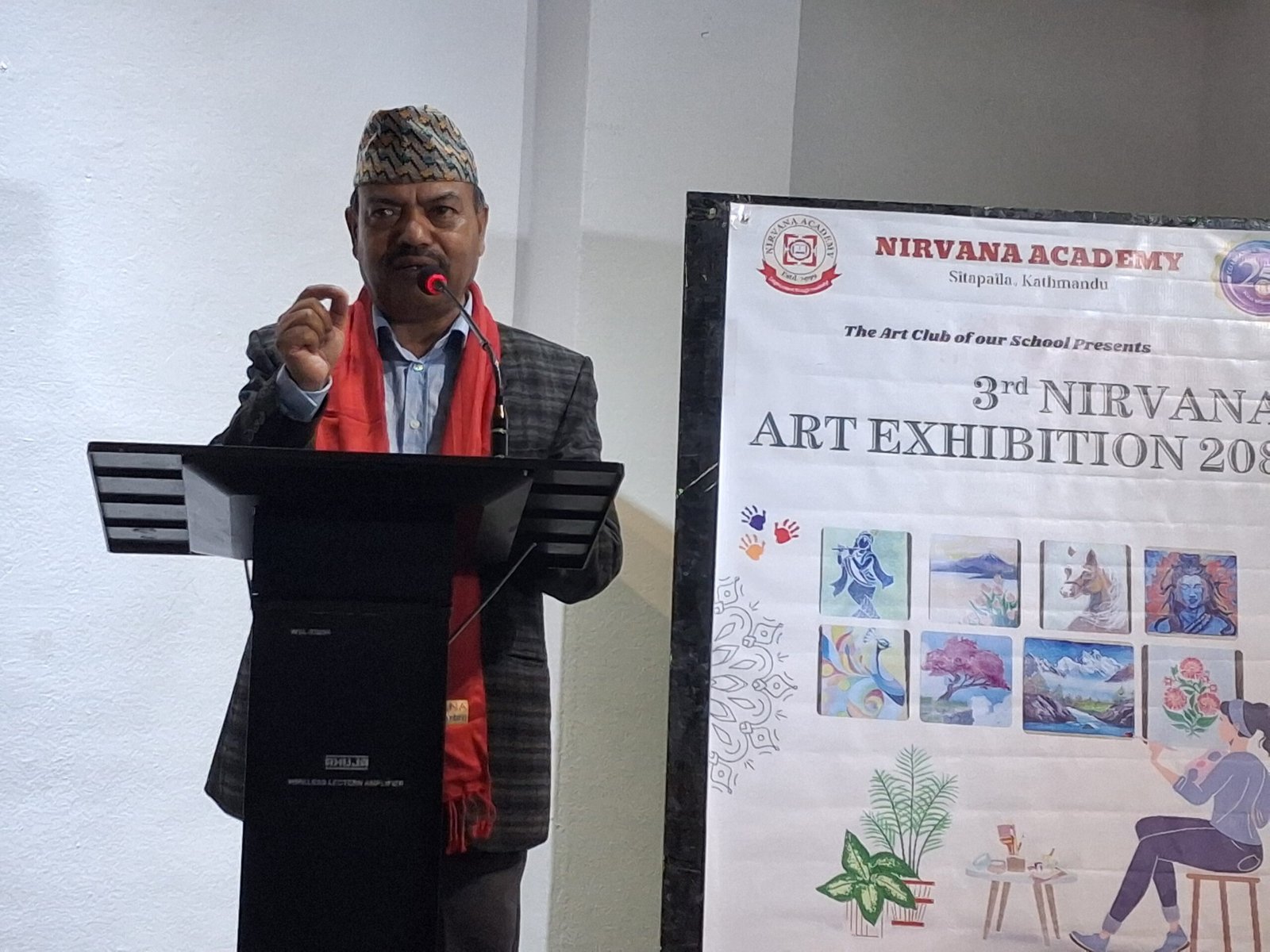 आयोजक विद्यालय निर्भाणा एकेडेमीका प्रिन्सिपल निराजन अधिकारीले स्वागत मन्तव्यका क्रममा विद्यार्थी, कलाशिक्षक तथा अभिभावकको सहजीकरणमा विद्यालयले यस स्तरको प्रदर्शनी आयोजना गर्न सफल भएको उल्लेख गर्नुभयो। उहाँले कला प्रदर्शनीलाई विद्यालयको ‘सिग्नेचर कार्यक्रम’का रूपमा स्थापित गरिएको बताउँदै कलामार्फत समग्र शिक्षामा गुणात्मक अभिवृद्धि गर्ने विश्वास व्यक्त गर्नुभयो ।