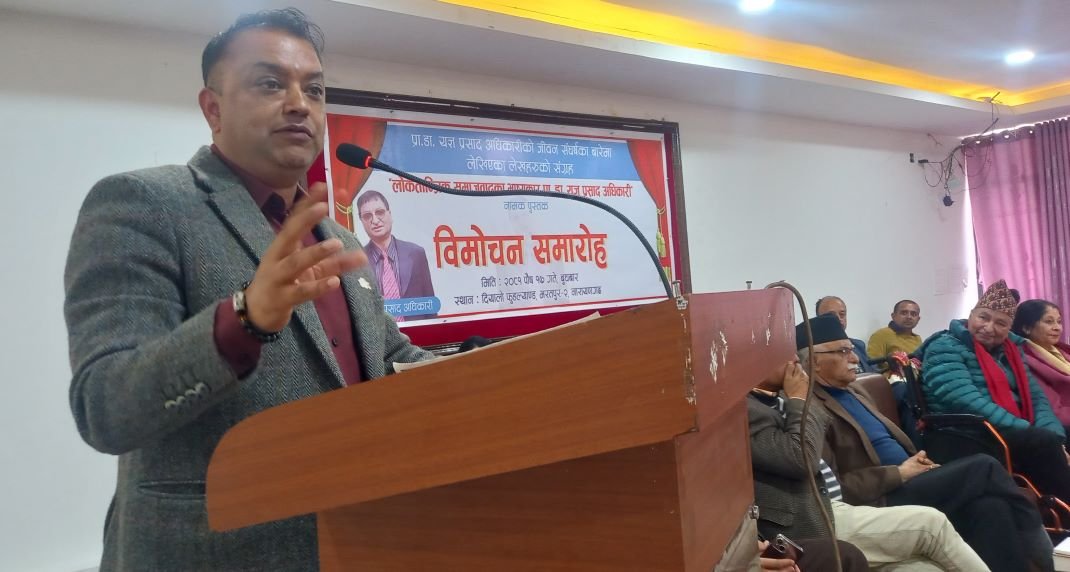 नारायणगढ, पुस १७ गते । नेपाली काँग्रेसका महामन्त्री एवं पूर्व स्वास्थ्यमन्त्री गगन थापाले अब नेपालमै सबै रोगको उपचार गर्न सक्नेगरी पूर्वाधार विकास भइसकेको बताउनुभएको छ । प्राडा. यज्ञप्रसाद अधिकारीको जीवन सङ्घर्षबारेमा लेखिएका लेखहरुको सङ्ग्रह लोकतान्त्रिक समाजवादका भाष्यकार प्राडा. यज्ञप्रसाद अधिकारी नामक पुस्तक विमोचन समारोहमा बुधवार महामन्त्री थापाले रहरले उपचारका लागि विदेश जानेलाई छाडेर बाध्यताले उपचार … Read more
